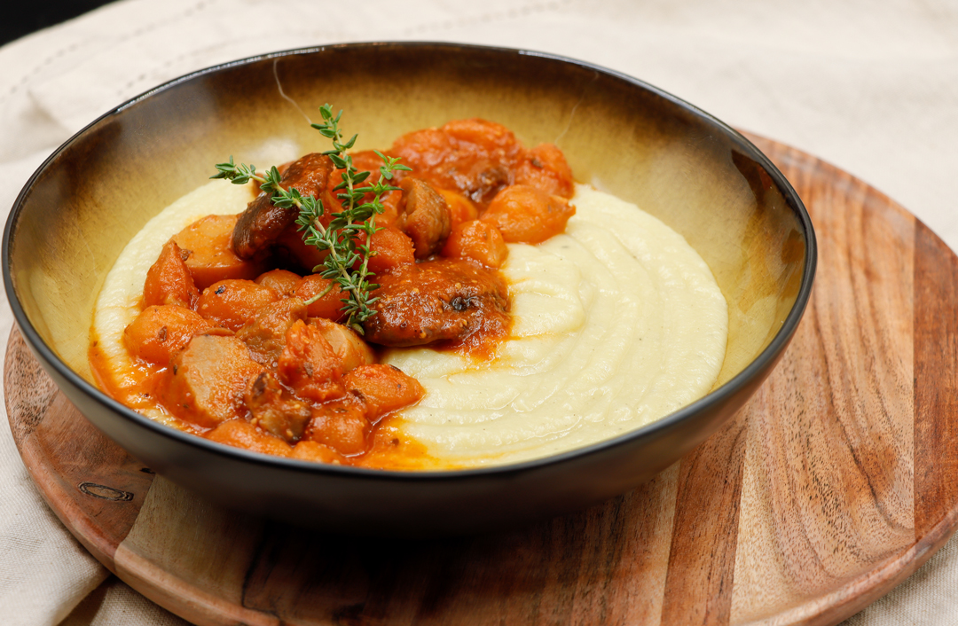 Στιφάδο με μανιτάρια, κάστανα και θυμάρι με πουρέ παστινάκι
